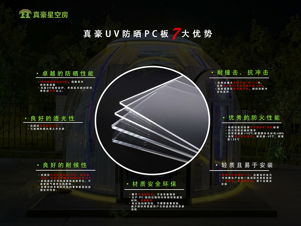真豪星空房采用UV防晒PC板,全透明的设计,无论放在什么场景,都能全方位无死角地欣赏到大自然的绝美风光。无论是清晨的日出,还是傍晚的夕阳,亦或是璀璨的星空,都能在室内尽收眼底。