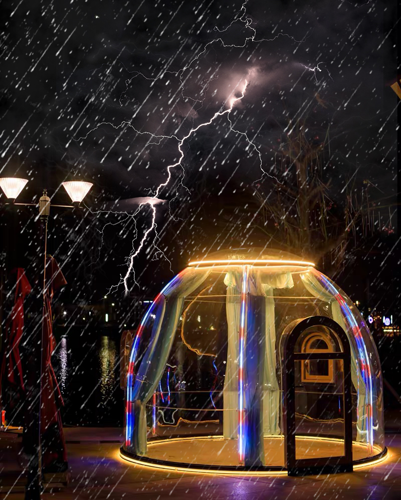 星空房的结构设计采用圆形或半球形顶部设计,这种穹顶设计结构稳定可靠,风阻小。整体防水性能好,能抗8-10级台风,能在海边、草原等多种大风环境下安心使用。