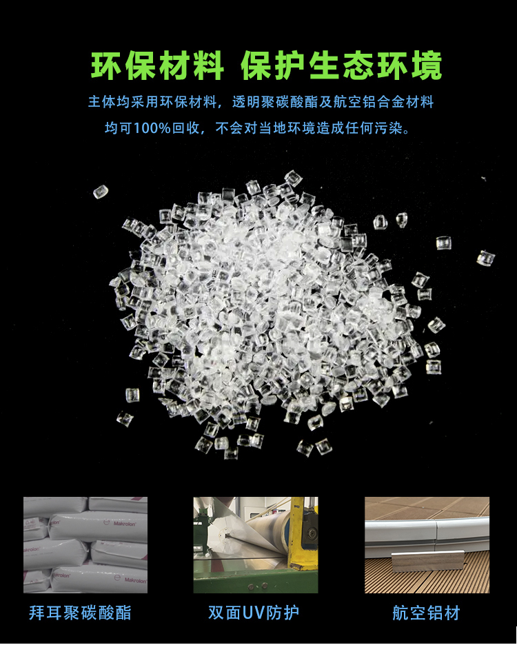 选用耐高温的透明聚碳酸酯材料,双面添加UV防护层,不仅具有出色的隔热防晒效果,而且透光度高,丝毫不影响您观赏外界美景。更具备超强耐用性,户外使用可达20年,不变黄、不脆裂。